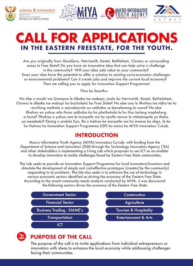 MIYA partnered with Department of Science and Innovation through its entity, Technology Innovation Agency (TIA), to bring a community-based Living Lab pilot programme that intends to use ICT and innovation as key drivers for viable solutions that tackle challenges faced by the Eastern Free State’s disadvantaged communities.